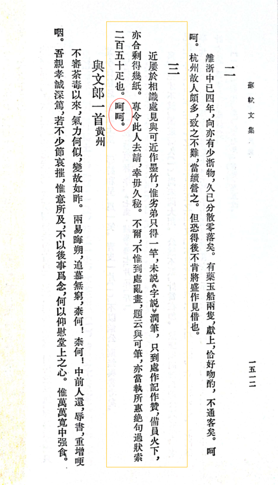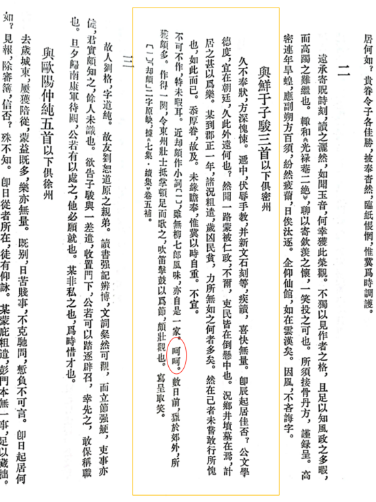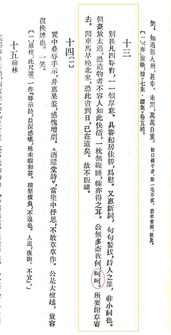 苏东坡的呵呵常用于与朋友的对话,比如给陈季常的书信中,苏轼写到:”一枕无碍睡,辄亦得之耳……呵呵。”意思是,只要我睡得好,写文章啊那都是小事儿,呵呵。