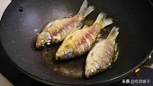 第六:然后放入鲫鱼小火煎制,这样蛋白质才能更好地激发出来,炖出的汤才会奶白,煎制一面定型后翻个面,煎制两面金黄,倒入开水,一定是开水,因为鱼在煎完之后是处于一个热的状态,如果直接就倒入冷水,会让鱼的肉质变散,同时还可能会带有腥味。但是用热水炖鱼汤就不同了,煎好的鱼和热水的温度差别不会很大,那么炖出来的鱼汤会更加鲜美,汤汁会比较白。开大火炖3分钟,这时不要盖锅盖,因为无论什么鱼,它的身体里都有一种三甲胺的成分,这是造成鱼腥的来源,所以做汤时要想这物质挥发掉,就要先开盖炖,如果盖盖会越炖越腥。