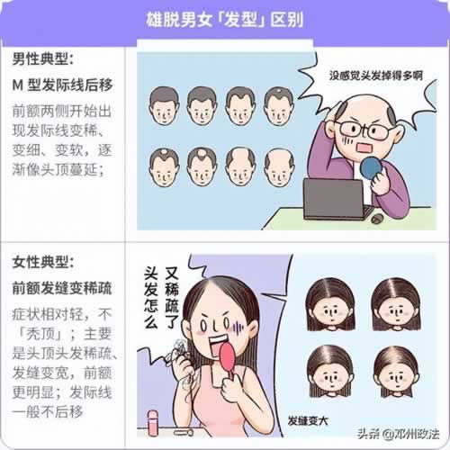 而且,它通常是青春期后慢慢发生的,不是一夜之间就「秃」了。男女头发稀疏的地方不同,多数伴有头皮油腻。