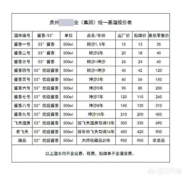 这是某酒业的基酒报价,基酒是指还没有经过勾兑的轮次酒。这些酒按年份和工艺分为不同编号,且分为出厂价和贴牌价,还规定了代理商的最低零售价。