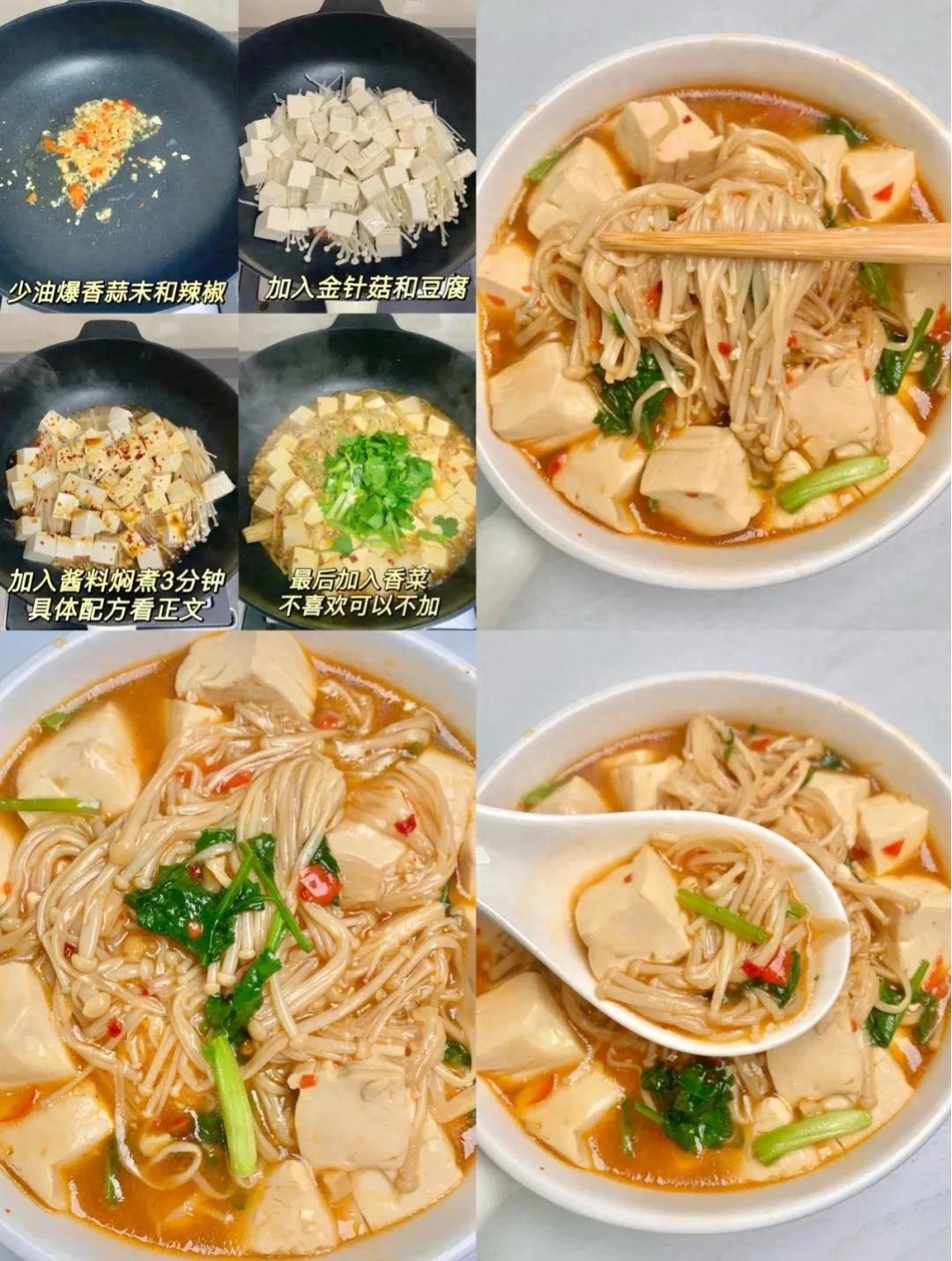 做法:1 少油爆香蒜末和辣椒 加入金针菇和豆腐 2 加入酱汁焖煮3分钟 最后加入香菜不喜欢可以不加