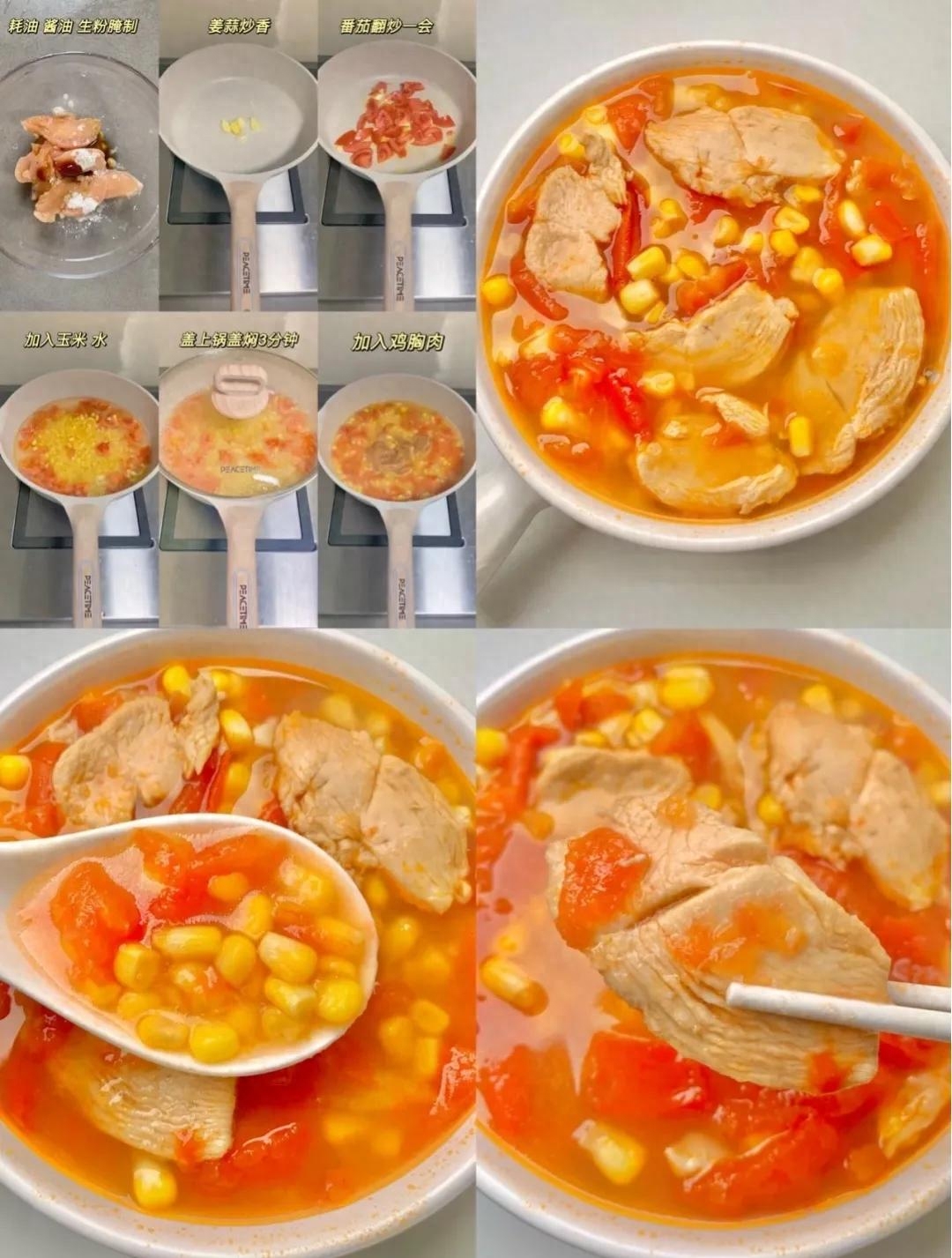 做法:1 鸡胸肉加耗油 酱油 生粉腌制 2 锅里加姜蒜炒香 加入西红柿翻炒一会 3 加入玉米 水盖上锅盖闷三分钟 4 加入鸡胸肉煮几分钟即可