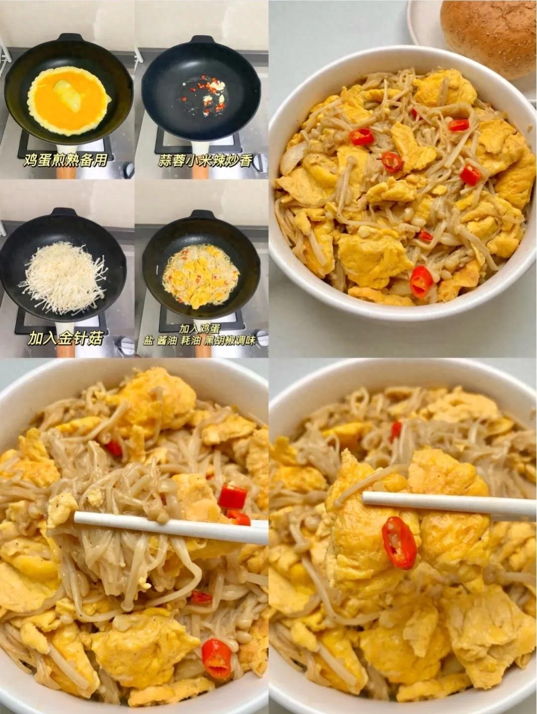 做法:1 鸡蛋煎熟备用 2 蒜蓉小米辣炒香 加入金针菇翻炒 3 加入鸡蛋盐 酱油 耗油 黑胡椒调味即可