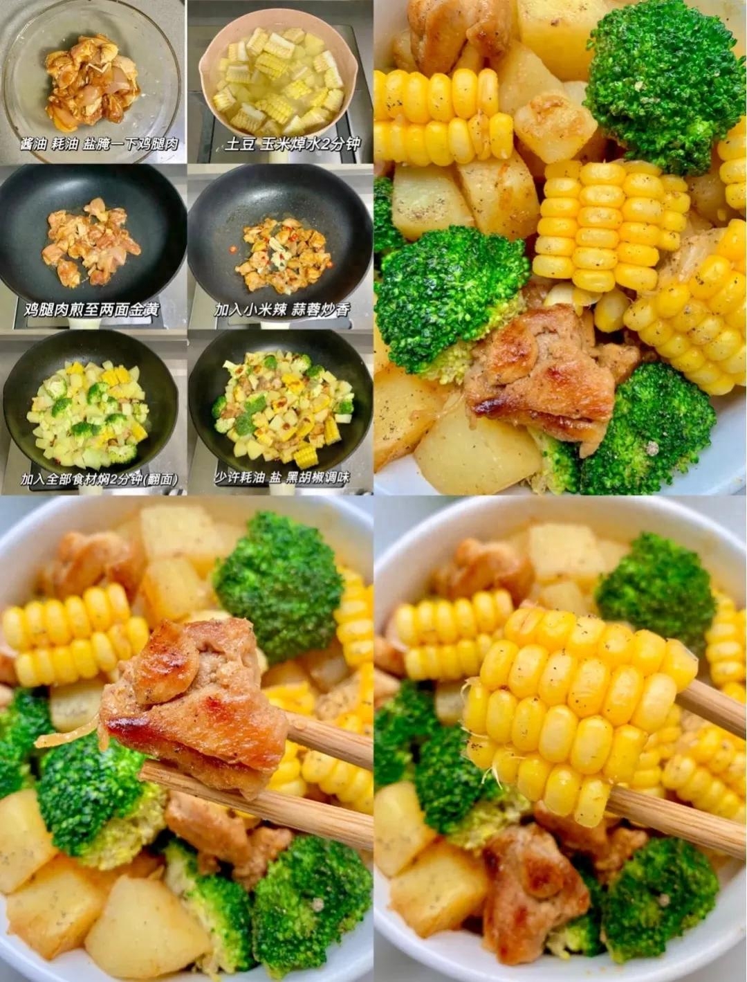 做法:1 鸡腿肉加酱油耗油 盐腌一下 2 土豆玉米西兰花焯水2分钟 3 鸡腿肉煎至两面金黄 加入小米辣 蒜蓉炒香 4 加入全部食材焖2分钟(翻面) 加少许耗油 盐 黑胡椒调味即可