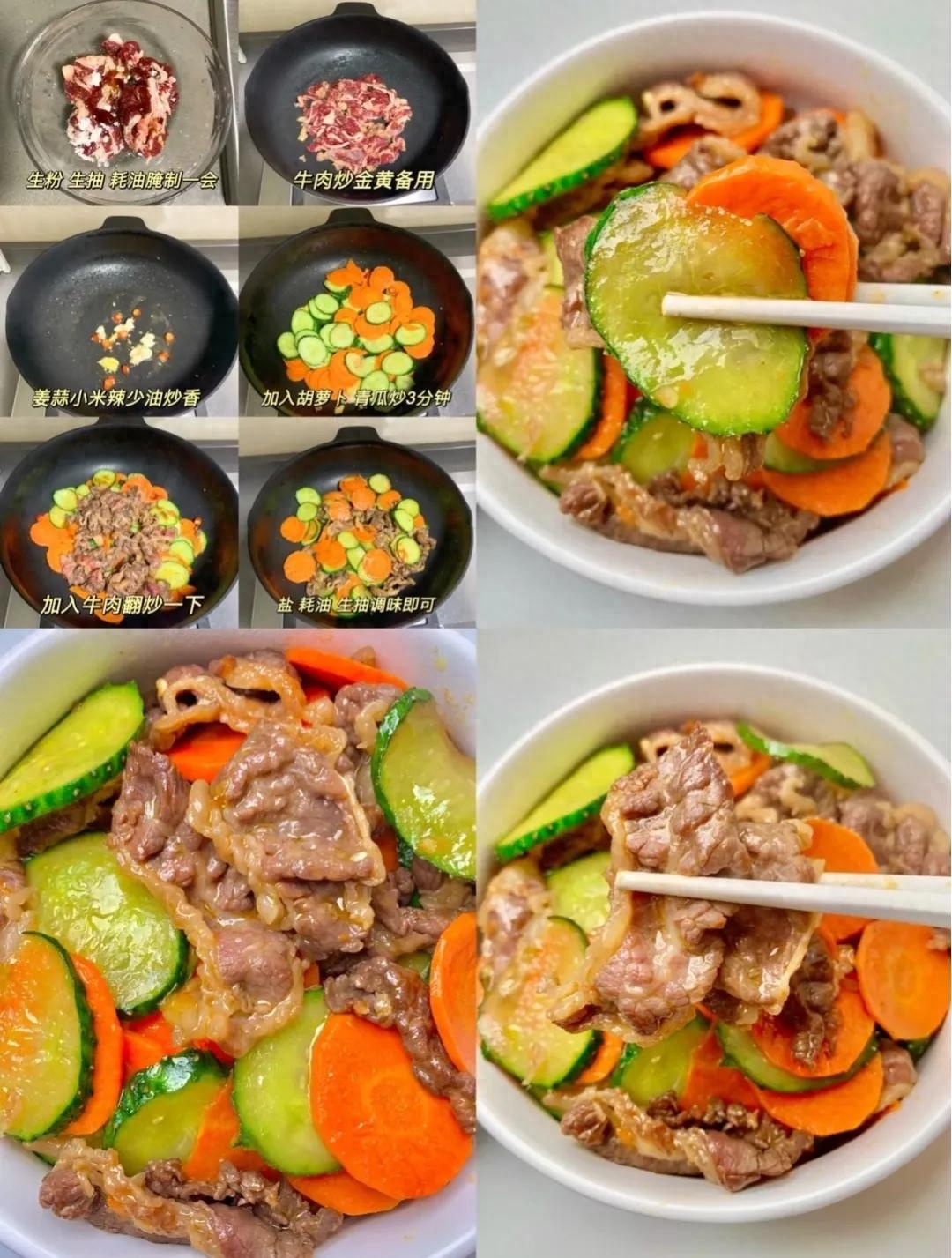 做法:1 牛肉切片加生粉 生抽 耗油腌制一会 2 牛肉炒金黄盛出备用 3 锅内加姜蒜小米辣少许油炒香 4 加入胡萝卜青瓜炒3分钟 加入牛肉 盐 耗油 生抽翻炒调味即可