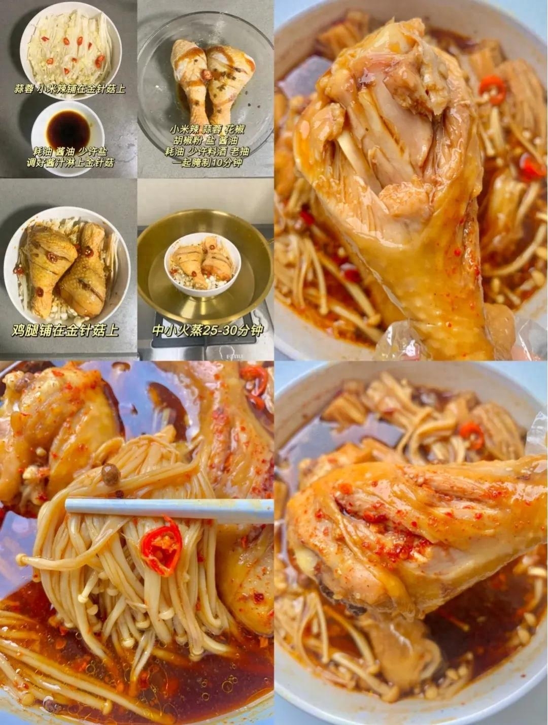 做法:1 碗底铺上金针菇 蒜蓉 小米辣 2 把调好的酱汁淋在金针菇上 3 鸡腿加小米辣 蒜蓉 花椒 胡椒粉 盐 酱油 耗油 少许料酒 老抽一起腌制10分钟 4 鸡腿铺在金针菇上 中小火蒸25-30分钟即可