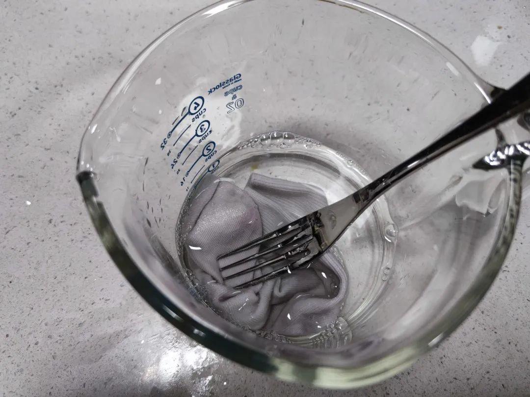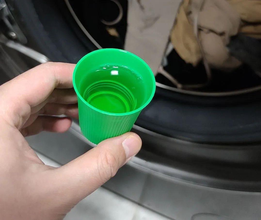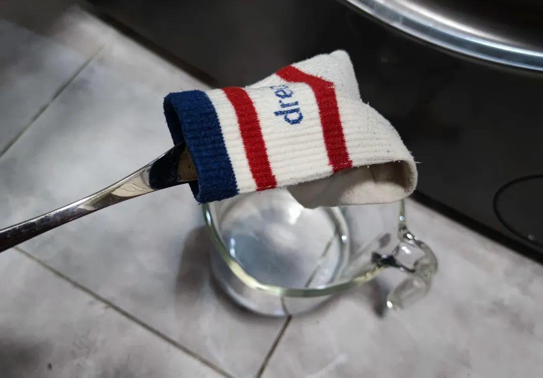 上面的实验里还剩了一双袜子,把它放进洗衣机,同样与其他衣物混洗,执行与上一次实验同样的程序,但添加了两瓶盖的消毒液,洗涤完成后取出袜子浸水取样,标记为样品 5。