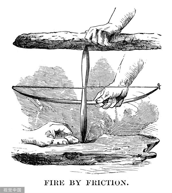 利用弓弦打孔法钻木取火(图片来源:视觉中国)