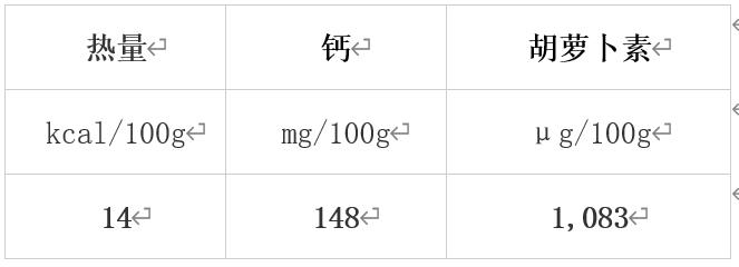 它热量低,钙含量很高。每 100g 里含有 148mg 的钙,是同等重量牛奶的 1.4 倍。如果是黑油菜,钙含量更高,100g 含有 191mg 的钙。