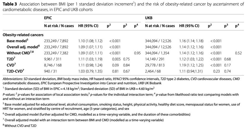 此次研究表明,在患有心血管疾病的情况下,BMI 升高相关的癌症风险上升程度更大,这突显了这些人群需要预防肥胖以降低患癌风险的重要性。