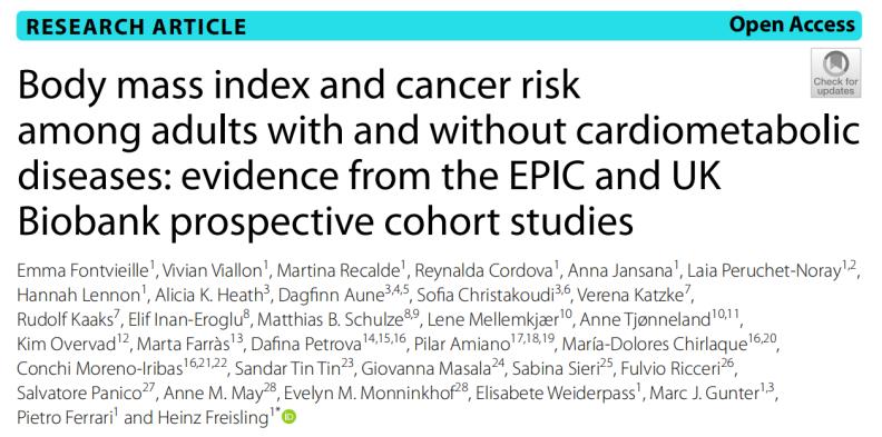 相关研究论文以“Body mass index and cancer risk among adults with and without cardiometabolic diseases: evidence from the EPIC and UK Biobank prospective cohort studies ”为题,已发表在科学期刊 BMC Medicine 上。该研究得到了世界癌症研究基金会(World Cancer Research Fund)的资助。
