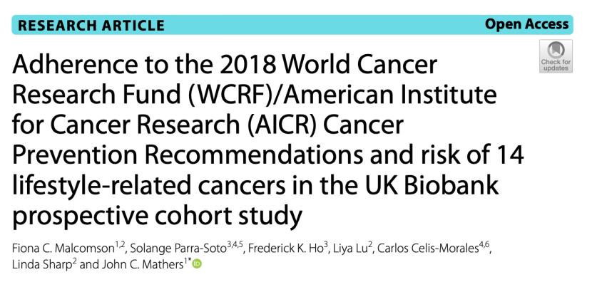 一项近期同样发表在BMC Medicine 上的研究表明,更多地遵守世界癌症研究基金会/美国癌症研究所(WCRF/AICR)的癌症预防建议(鼓励健康的生活方式)与降低所有癌症和某些癌症(如乳腺癌)的患病风险有关。