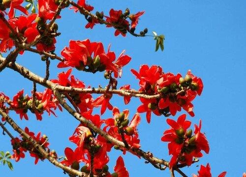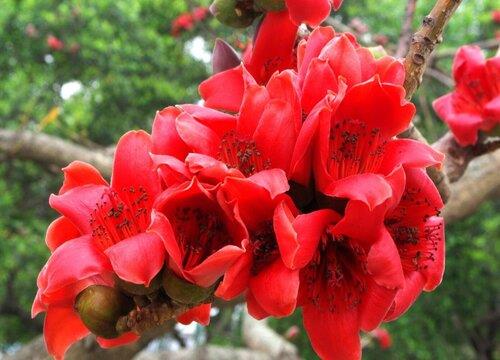 众多红艳艳的花朵挂在高大的本棉树上,显得大气、热闹和美丽。
