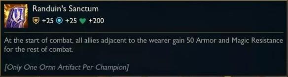 战斗开始时,佩戴者周围一格内的友军获得50护甲和魔抗,持续到战斗结束。