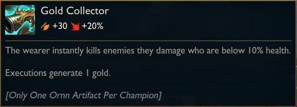 佩戴者的伤害会直接处决生命值低于10%的敌人,并且会获得1金币
