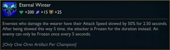 对佩戴者进行攻击的敌人会被减少50%攻速,持续2.5秒,当被减速达到5次时,敌人会被冻结。每个敌人每5秒只会被冻结一次。