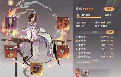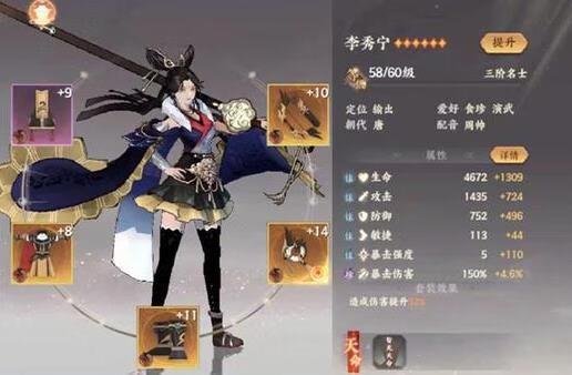 玄阶单体战神。六星李秀宁有超越一星天卡的输出能力,开局二技能+流血有360%的恐怖系数,是最简单无脑的单体爆发。本阵容中,速度快过两位aoe核心,可以先手压低敌方一人血线,再由AOE名士收尾。