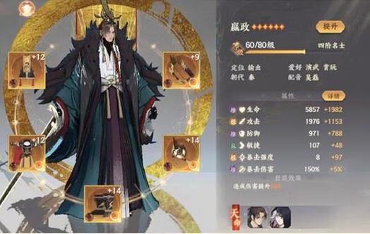 我的六星赢政在金踏破+10套的基础上洗出了四条忘川风华,可以算上三测最强赢政了。第一回合赢政普攻磨血攒金龙,为莫邪的爆发压低全员血线。若莫邪爆发失败或还有残血,第二回合由袁天罡打火后可以释放觉醒清屏。