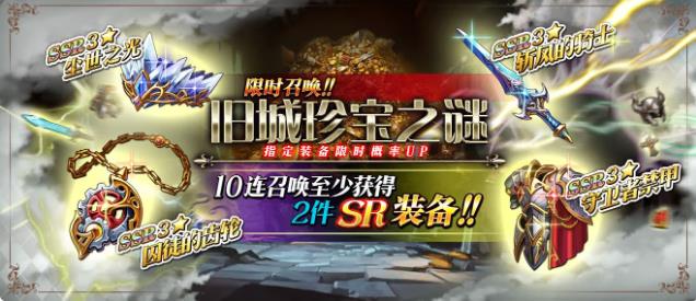 限时召唤「旧城珍宝之谜」中SSR级装备斩风的骑士、守卫者禁甲、尘世之光、囚徒的齿轮出现概率提升!