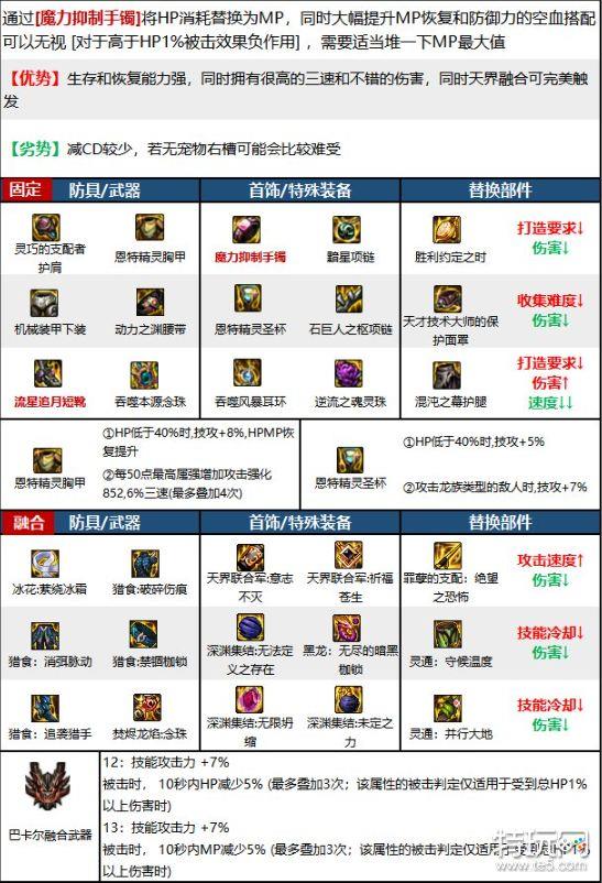 【配装特点】通过魔力抑制手镯将HP消耗替换为MP,同时大幅提升MP恢复和防御力的空血搭配可以无视对于高于HP1%被击效果负作用,需要适当堆一下MP最大值。