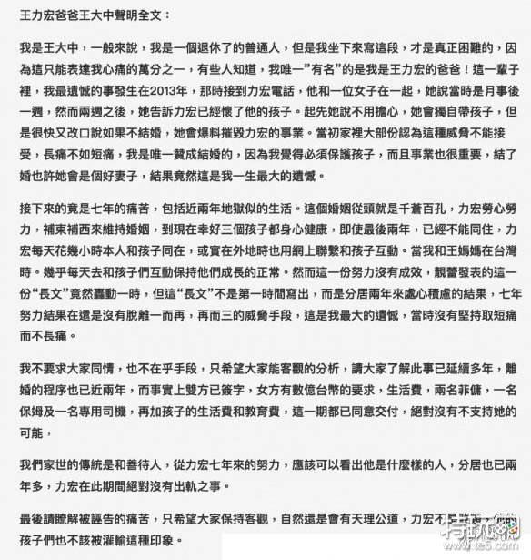 王力宏爸爸王大中聲明全文:
