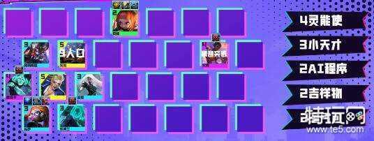 2、羁绊:4灵能+3小天才+2AI+2吉祥+2淘气包+2爱心使者+2福牛+2秘术+2黑客+1平民