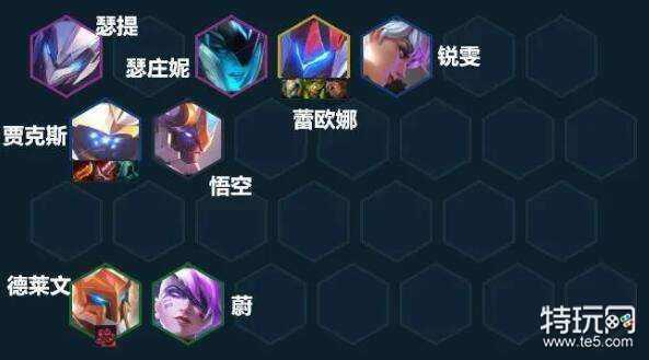 1、阵容搭配:贾克斯+瑟提+瑟庄妮+蕾欧娜+锐雯+悟空+德莱文+蔚
