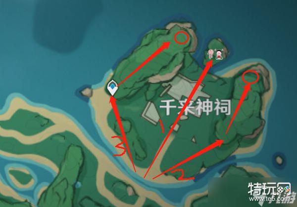 1、供奉栖木三个位置分别在 千来神 祠、知比山、逢岳之野,具体位置如下图;