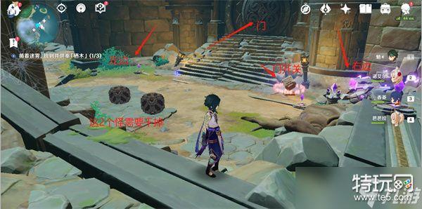 14、接着继续破解,下一个石门,先找齐3个精灵,第1个很明显,另外2个,位置如下图;