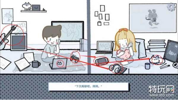 1、点击两个人共同有的东西,比如游戏机、吉他、耳机还有两只猫咪。