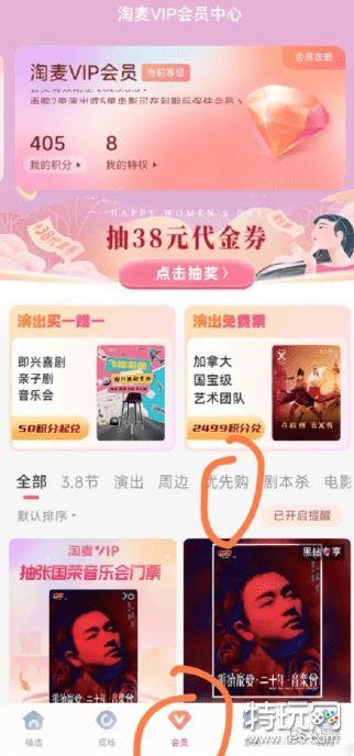 2,进去大麦app,用同一个淘宝账号登录大麦。点击会员。就能看到自己的积分。我是405积分。杰哥演唱会优先购是299积分兑换。