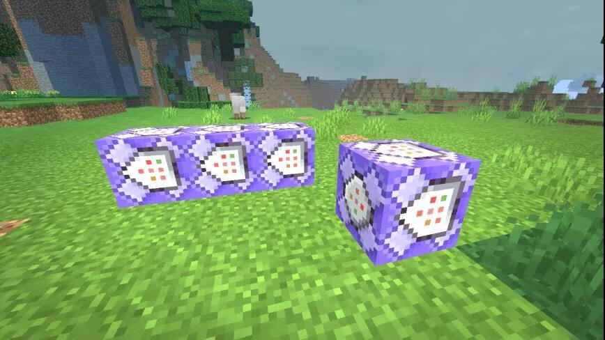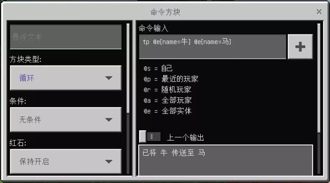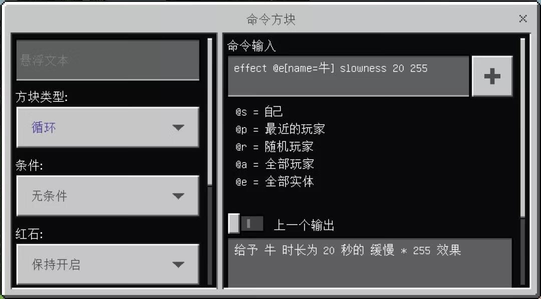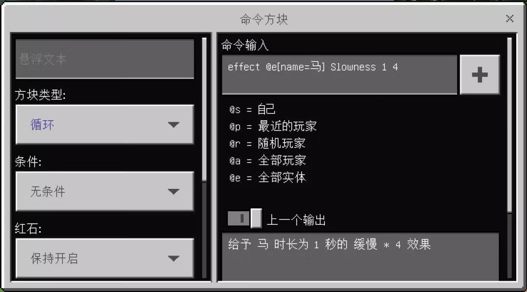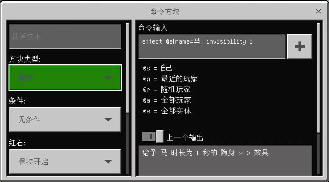 然后按顺序随意地摆放四个命令方块,命令设置全部为:方块类型设置为循环,条件为无条件,红石保持开启。