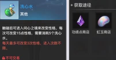 3.使用洗心水,使用后可以进入问心之境来改变性格,在其中每消耗5瓶洗心水可以自主选择获取15点任意性格值,洗心水可以在【功绩点商店】或【虹玉商店】购买。