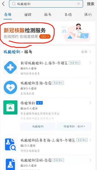 1、我们可以使用支付宝来查询,点击打开支付宝,搜索“核酸检测”,进入“新冠核酸检测服务”。