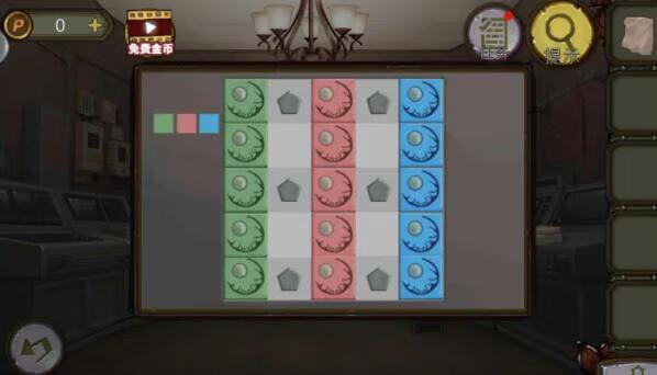 机关解法:对应左上角的颜色,第一列是绿色,第三列是红色,第五列是蓝色。