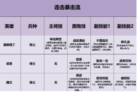 进阶搭配则是依据英雄技能搭配,如:康斯坦丁+武圣+魏兰。这样搭配,完美运用上康斯坦丁的主将技,再搭配三个英雄各自的固有技和装备的副技能,使队伍提升武力、攻击速度、暴击率,队伍的战斗能力大幅提升。