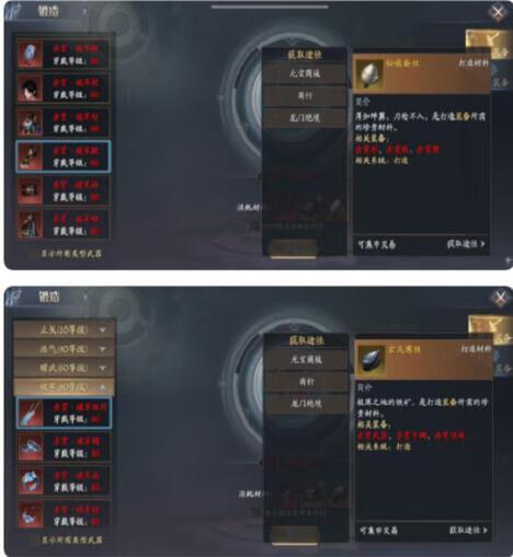 上衣、护腕、裤子的打造,需要秘银蚕丝,武器、手镯、项链的打造则必需玄天寒铁。这两样材料的产出非常相似,可通过龙门绝境活动获得,也可以在元宝商店和商行直接购买。