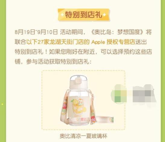 1、8月19日—9月10日期间,奥比岛与Apple开启“盛夏之旅”联名活动。玩家预约前往门店,即可免费领取周边实物奖品和游戏礼包