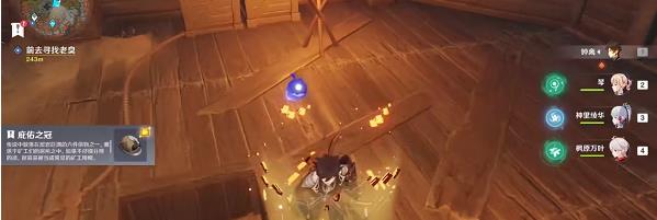庇佑之冠在一个房间里面,可以跟着仙灵进入,把炸药桶炸掉,将最后一个房间的稻草烧掉,之后点击调查,获得庇佑之冠。