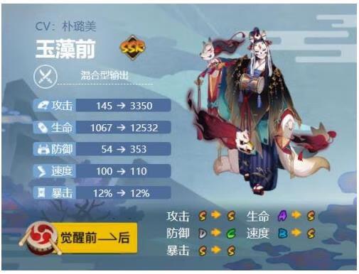 基本上可以看到玉藻前是一个纯输出的式神的,可以切换全体攻击或者单体攻击的状态,但是两个技能都需要耗费3火,可以说是一个用火大户了。不得不说单体攻击确实伤害很高,全体的话有点一般。在看看玉藻前的初始面板,确实可以说是所有式神当中最强的了,觉醒后有4个s,同时初始暴伤160%也太恐怖了。