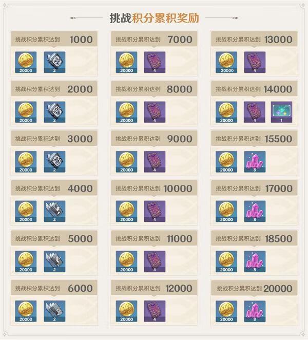 活动期间内,旅行者可以多次挑战同一挑战关卡,刷新该关卡最高纪录。累计挑战积分为当前所有挑战关卡最高纪录积分之和,达到指定累计挑战积分时可领取对应的奖励。