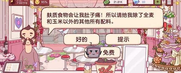 1、顾客:麸质食物会让我肚子痛!所以请给我除了全麦和玉米以外的其他所有配料