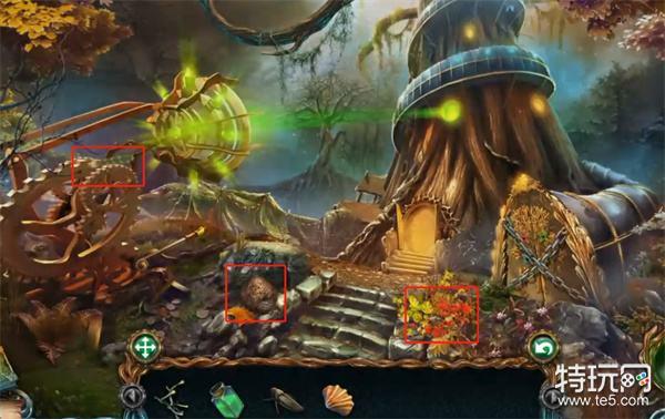 2、点击左侧树塔方向,拾取机器上的羽毛,红果下拾取贝壳;