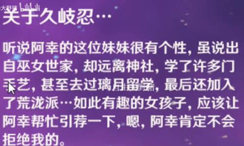 从早柚和八重神子的语音中,我们可以得出第一个结论:久岐忍是女生,出生于巫女世家,是阿幸的妹妹,还曾经在璃月留过学。