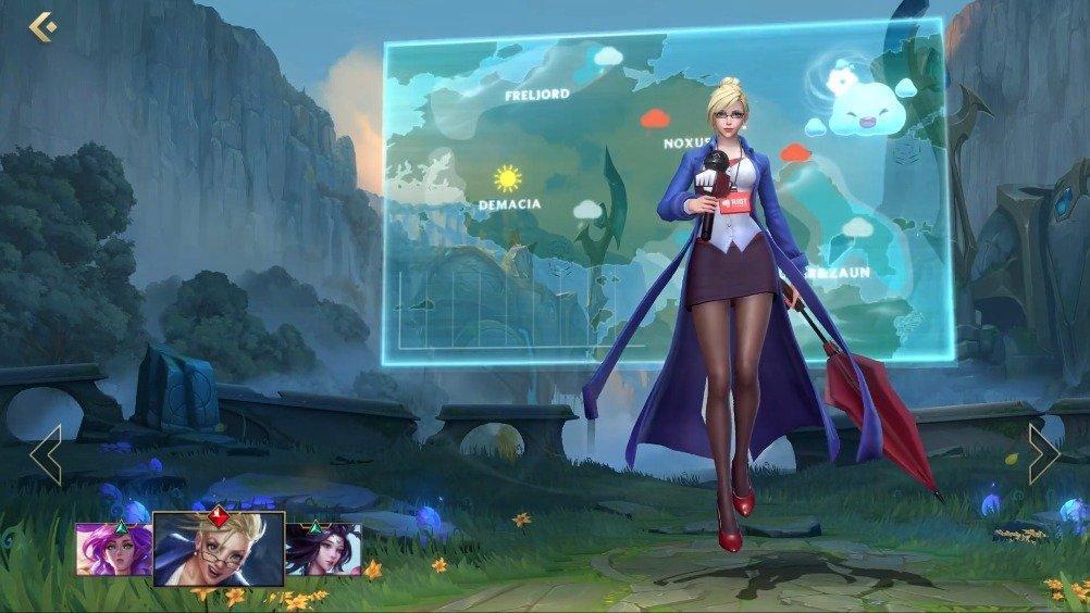 2.2b版本会推出6款新皮肤,分别是:德莱厄斯-魔狼战神、圣狮战神-盖伦、气象主播-珍娜、致命血莲-卡兹克、暗影潜行-雷恩加尔、人工智慧-娜米。下面就请大家来欣赏一下来自珍娜的气象主播皮肤。