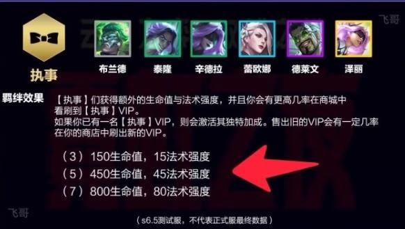 【执事】们获得额外150/450/800生命值和15/45/80法术强度。你在招募商店中有更高几率刷新【执事】VIP英雄。如果你场上拥有一个【执事】VIP英雄,他们的独特能力会被激活。售卖一个已有的VIP英雄后,有机会在招募商店中刷新新的VIP英雄。