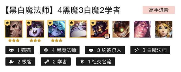 羁绊效果:1猫猫4黑魔法师3约德尔人3白魔法师2极客2学者1社交名流