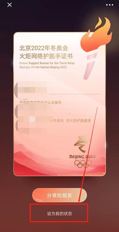 点击证书下面的【设为我的状态】,然后点击【就这样】即可将微信状态设置成【护跑火炬】状态。