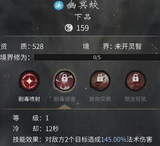 蛟的二三技能说白了都是增加法伤,一四技能是单纯aoe 分别打3和打4个目标,秘境挂机最好应该就是带它。