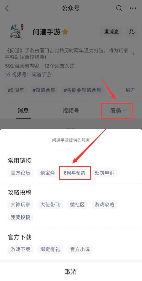4月11日上午11:00后,道友们可以进入问道手游公众号,点击菜单中的【服务】-6周年预约,即可跳转至年度大服预约界面。